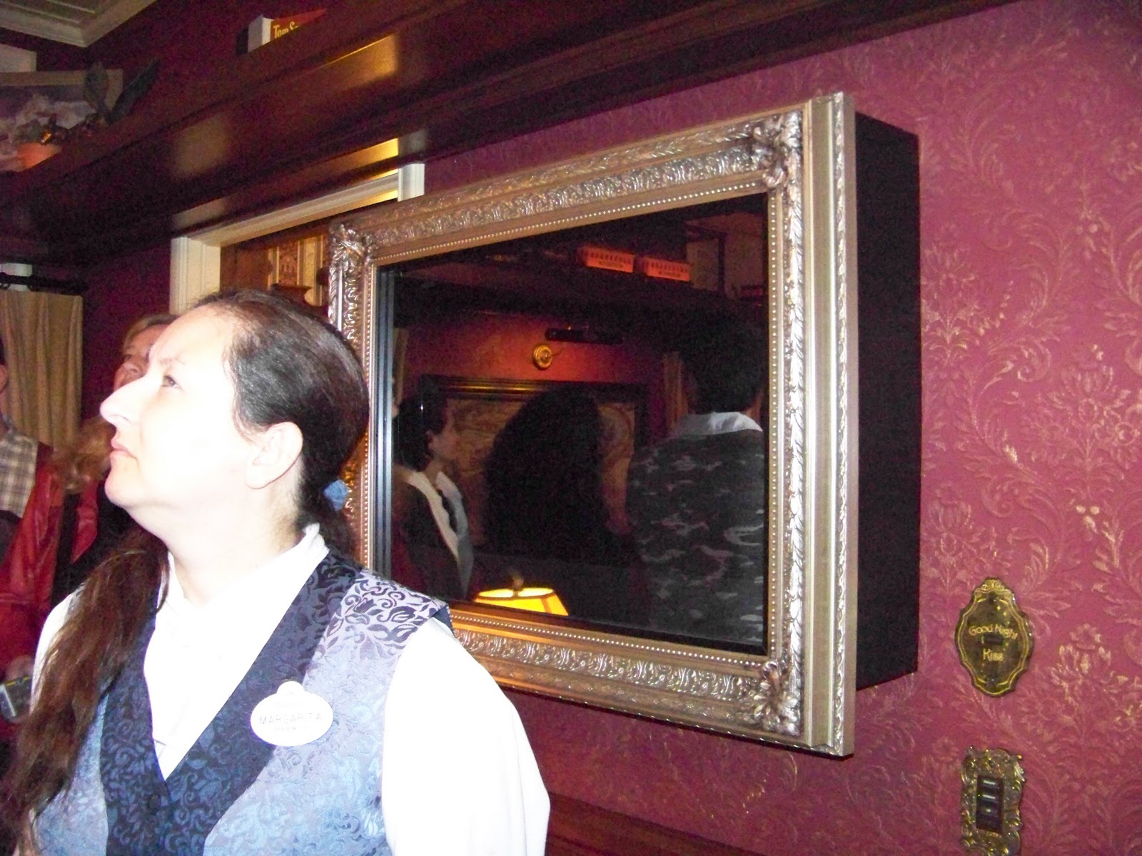 This cool "D" is an electronic card reader. The guest waves a special key card in front of it and it unlocks the door to the suite. You can see my costume reflected in the mirror finish, lol.